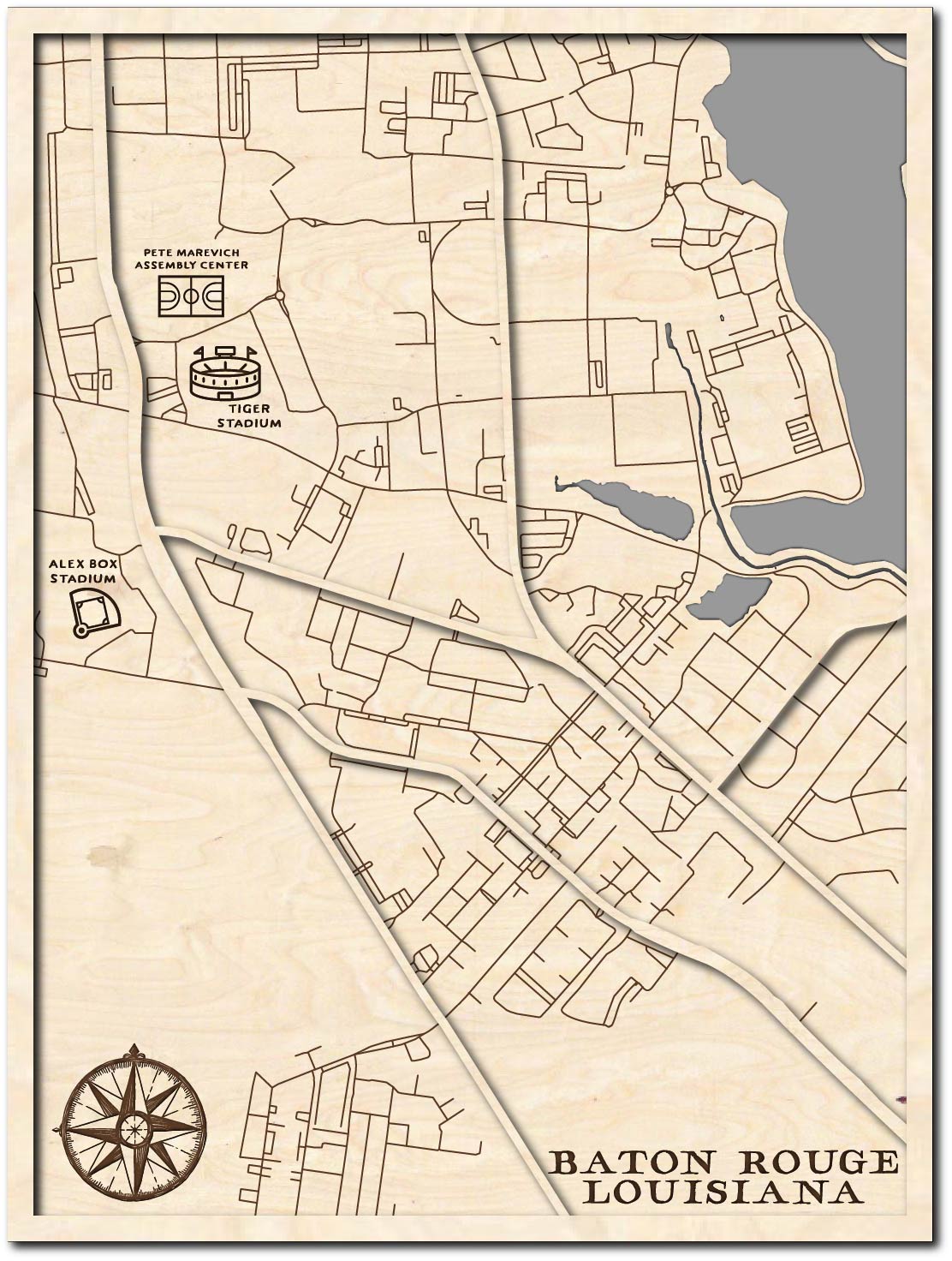 Honor a graduate with our Baton Rouge map! Featuring the stunning Tiger Stadium, Pete Maravich Assembly Center, and Alex Box Stadium, this multi-layer artwork embodies LSU's rich tradition. A thoughtful gift for any Tiger fan to treasure their college memories!
